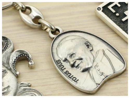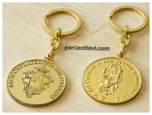 Portachiavi con ciondolo coniato rappresentante immagini sacre, bordi in rilievo e parte centrale coniata in tre dimensioni.